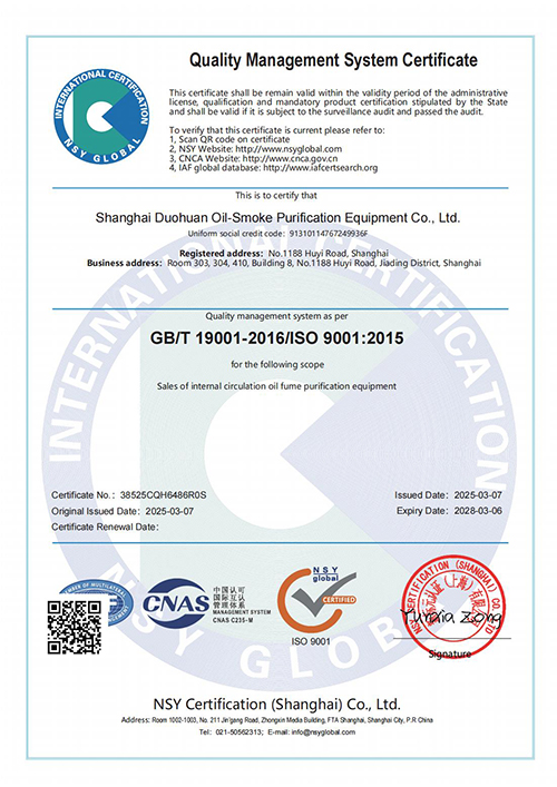 ISO9001認證 是全球公認的質量管理標準,它代表著國際社會對上海多環油煙凈化設備有限公司產品質量的認可,也標志著多環公司在規范化、標準化、國際化的道路上邁出了堅實的一步。